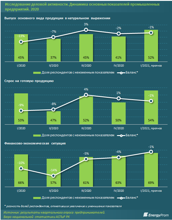 Так, по результатам конъюнктурного обследования деловой активности организаций, проведенного БНС АСПиР РК в четвертом квартале 2020 года, лишь 54% казахстанских промышленников прогнозировали на I квартал текущего года неизменный спрос. В то же время количество респондентов, прогнозирующих снижение спроса, на 1% превысило число тех, кто ожидает улучшения.