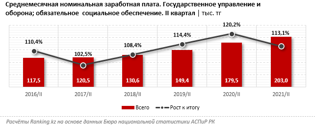 Больше всего среди занятых в отрасли зарабатывают работники в сфере обязательного социального страхования: 566,8 тыс. тенге, плюс 12% в реальном выражении. Работники сферы предоставления государством услуг обществу в целом получали среднемесячную заработную плату в размере 207,3 тыс. тенге (плюс 2,4% за год), работники госуправления общего характера и социально-экономического управления – 196,7 тыс. тенге (плюс 8,2%).