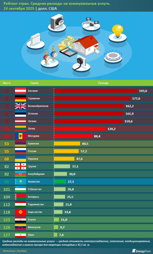 Тем временем самые значительные суммы в мире на ЖКУ тратят жители ведущих европейских стран: в Великобритании на 24 сентября 2025 года средние месячные расходы на коммунальные услуги составили 162,2 доллара, в Германии — 177,6 доллара, в Австрии — 193,6 доллара.