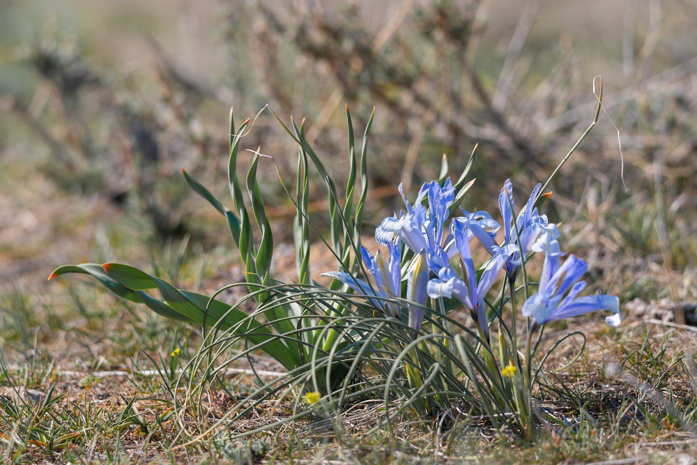 Сине-фиолетовыми пятнами на фоне почти коричневой земли выглядели кусты ирисов, которые, как и большинство диких тюльпанов, внесены в Красную книгу.