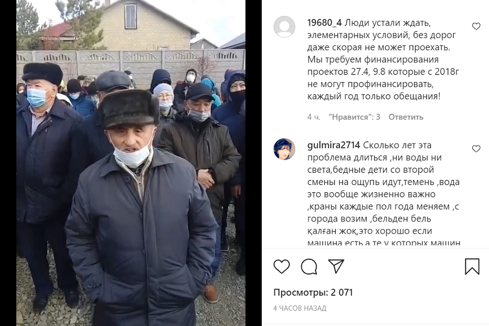 "Это наш крик души. На протяжении трех лет проект растягивается. Финансирование слабое. Мы устали ходить по колено в грязи. Весной, осенью ни проехать, ни пройти. Обещали дополнительное финансирование в размере 800 млн тенге и теперь мы узнали, что республиканская бюджетная комиссия не одобрила и в связи с этим работы по капитальному ремонту встанут. Улицы останутся незавершенными. Естественно, есть угроза, что на следующий год проект снова встанет. Мы требуем, чтобы эти 800 млн оплатили подрядчикам. Компания BI Group, подразделение "Автодор-НС". Мы были месяца два назад у их руководителей они пошли навстречу и сейчас эти работы выполняют за счет своих средств. Но у них, естественно, бюджет тоже не резиновый", - говорит житель поселка Амангельды Муратов.
