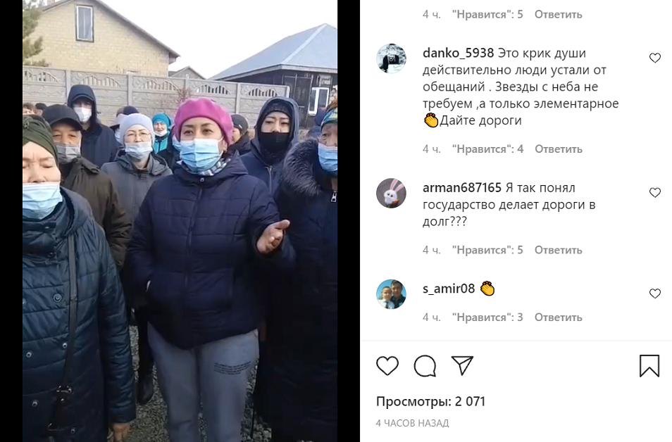 "Республиканская комиссия, просим вас расследовать. Есть заказчик, почему он ее следит. Качество дорог оставлять желать лучшего. Минфин, бюджетная комиссия, наше правительство, просим смотреть, куда выделяется деньги. Почему мы должны следить? Нам нужны элементарные блага, вода, свет, дороги", - возмущаются жители поселка.