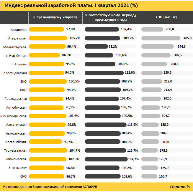 Среднемесячная номинальная заработная плата по РК по итогам первого квартала текущего года составила 230,8 тыс. тг. Ее покупательная способность снизилась на 3% к предыдущему кварталу (четвертому кварталу 2020-го), при этом по сравнению с первым кварталом 2020 года СЗП выросла на 7,4%.