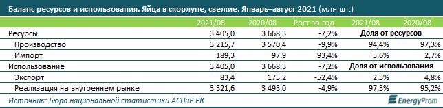 По итогам января-августа 2021 года местные компании обеспечили спрос (реализация на внутреннем рынке плюс экспорт) на свежие яйца в скорлупе на 94,4%, против 97,3% годом ранее.