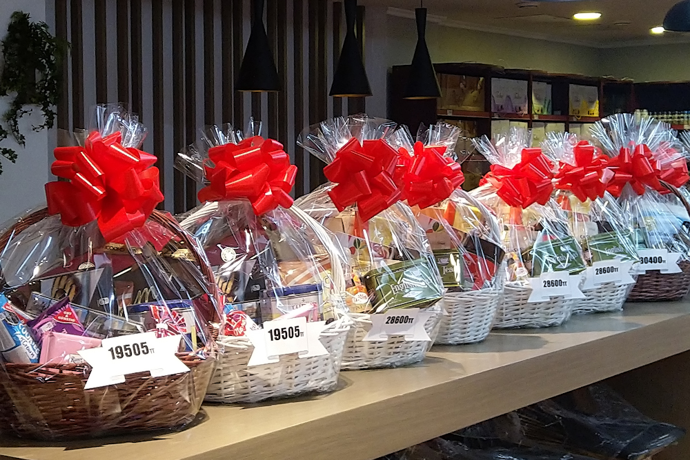 Некоторые супермаркеты предложили праздничные наборы подарков для женщин, со сладостями и элитным алкоголем.
