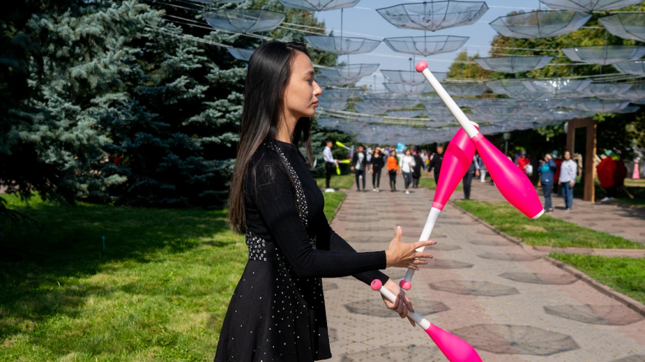 Молодые артисты цирка и учащиеся циркового колледжа устроили импровизированное выступление на одной из аллей парка.