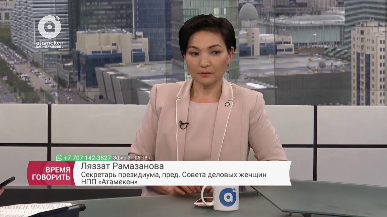 Гости программы: секретарь президиума, председатель Совета деловых женщин НПП РК "Атамекен" - Лаззат Рамазанова, директор регионального филиала Народного банка Казахстана - Жанар Рахимова.
