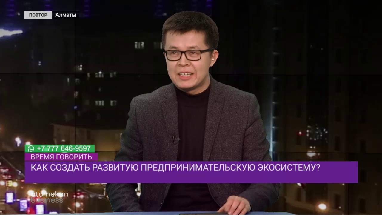 Гости программы: директор Палаты предпринимателей г.Алматы - Багдат Телебай; директор бизнес-инкубатора - Алим Хамитов.